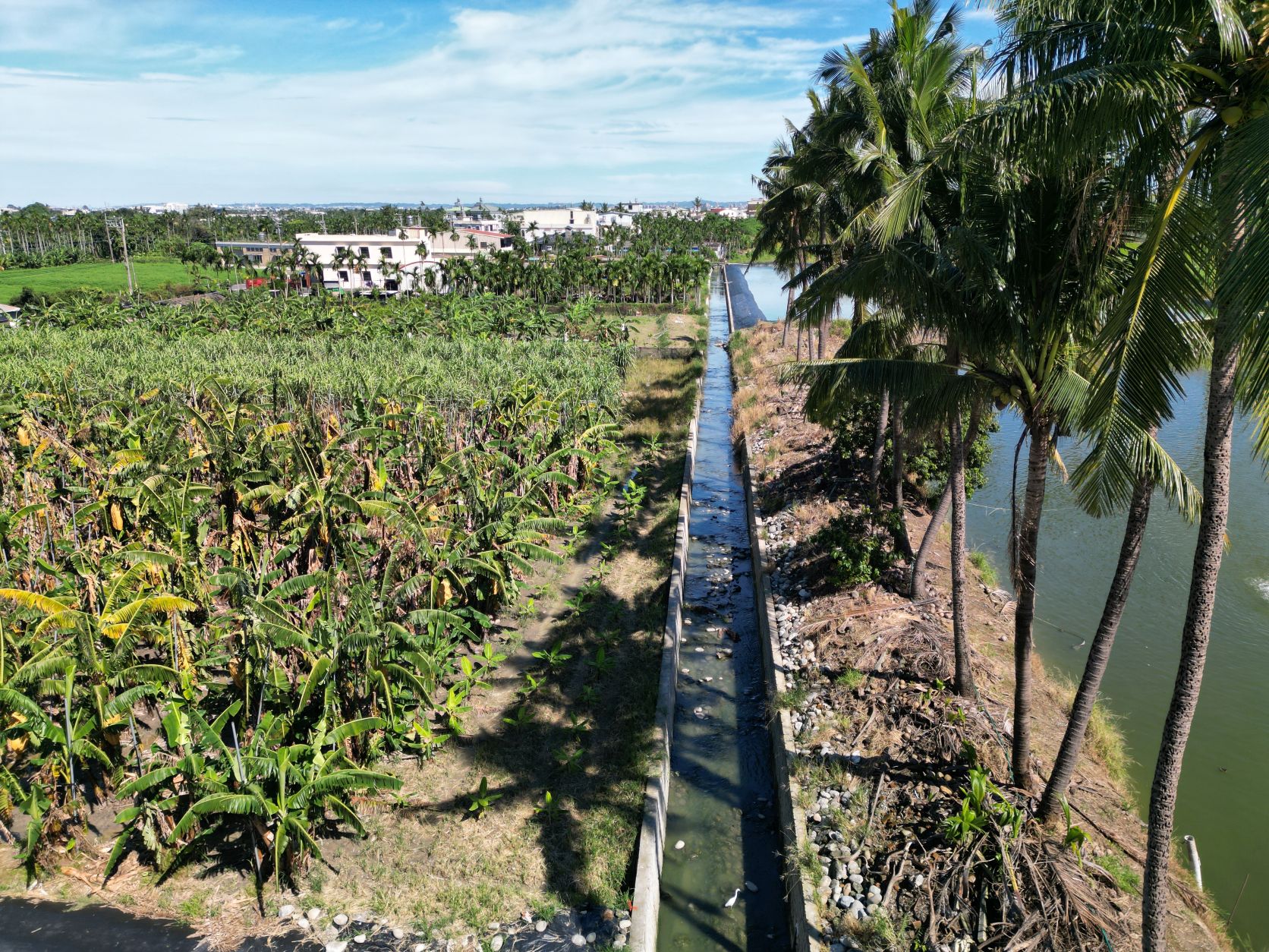 設計上的最大特色在於不封底工法與就地取材,將拆除的舊砌石重新鋪設於渠底,不僅能涵養地下水,更營造出多樣化的水域生態環境。清澈的水流映照著藍天與椰影,讓原本荒廢崩塌的舊渠道,轉化為一條兼具防洪安全與自然美感的鄉間水路。
