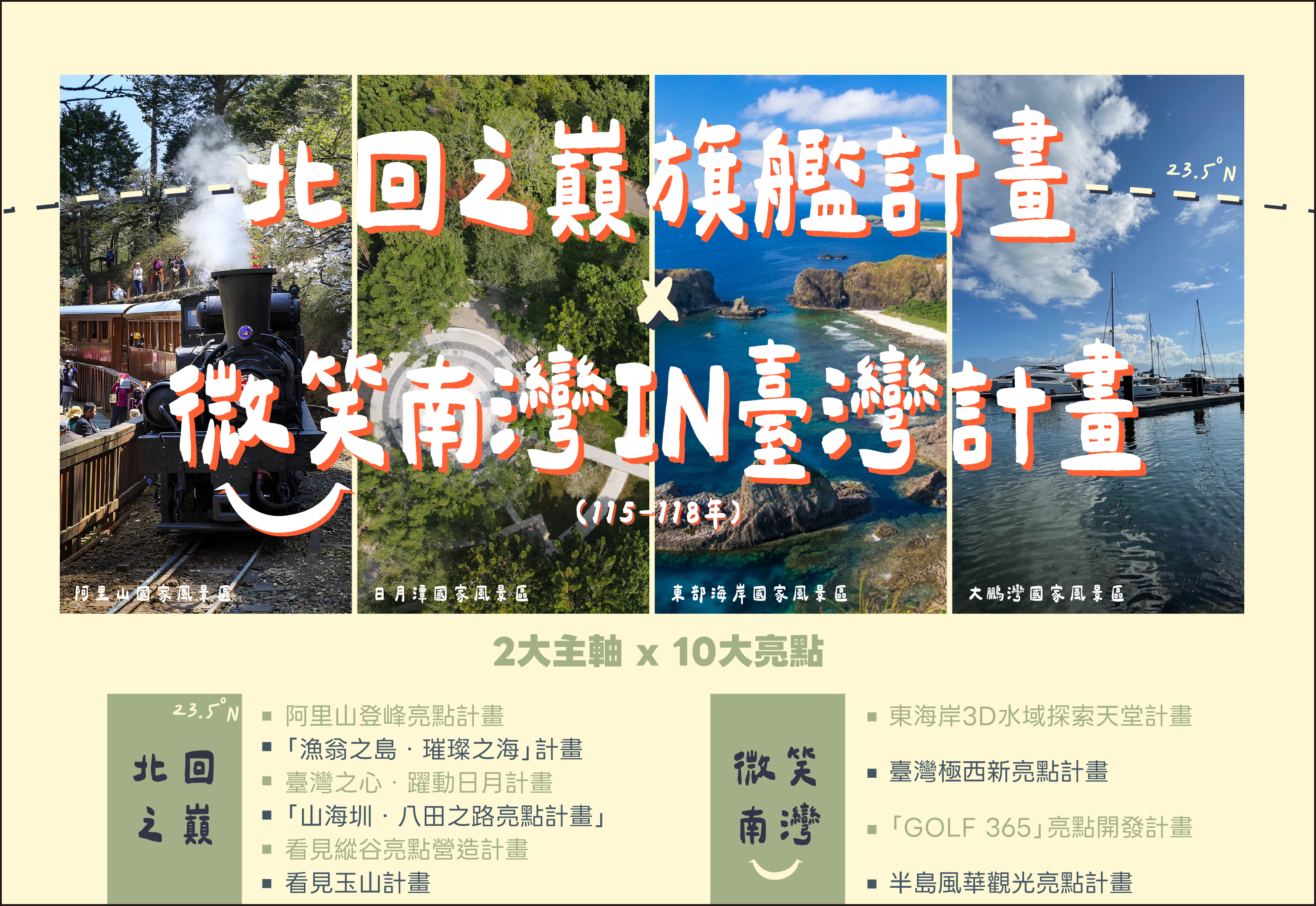 由於臺灣同時位於北回歸線,及歐亞大陸板塊和菲律賓海板塊交界處,在地形及生態多樣性上,極具觀光價值,而為串聯資源並促進區域觀光發展,行政院核定「北回之巔旗艦計畫—微笑南灣IN臺灣計畫」(115-118年),以北回及南灣為兩大觀光主軸,規劃10大亮點計畫,期透過呈現各地方獨特的生態環境及歷史文化,吸引更多國際旅客來臺,也讓國人更親近自然與人文地景,預期將創造觀光產值新臺幣1,226億元。
